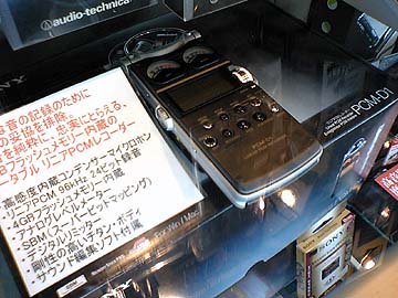 右はシマムセン2階で売られているソニーのPCMレコーダー。型番はPCM-D1。記録媒体は内蔵フラッシュメモリー4G、及びメモリースティック。機器の上部にステレオマイクが搭載されている。ソニーらしいメカニックで洗練されたデザインだが、マイクを内蔵させる必要があったのかどうか、評価の分かれるところ。定価はオープン価格。実売は196,800円に斜線が引いてあり、さらに安くなるようだ。 生粋のオーディオ店でポータブル型のデジタルレコーダーを販売している店は珍しい。余談だが、秋葉原で同機を販売しているオーディオ店は、ヨドバシマルチメディアアキバくらいだったはず。秋葉原でデジタルポータブルレコーダーの品揃えが豊富なのは、秋葉原ラジオ会館2階の業務用音響機器専門店TOMOCAプロショップ。 同機を始めとして、この1年ほどの間にデジタルメモリー搭載のポータブルデジタルレコーダーが相次いで発売されている。これはまだ序章なのかも知れない。近いうちに、これら新世代のデジタルデンスケによる野外録音ブームが再燃するかも。 |