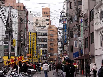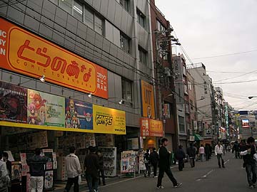 | でんでんタウンの裏通り。とらのあな、コトブキヤ、KBOOKS、イエローサブマリン、ソフマップが軒を連ねる。この界隈、店名を聞いて想像がつく通り、でんでんタウンで最も賑やかなオタクスポットなのだ。メイドカフェもこの一帯に散在している。でんでんタウンは交通の便がいまいちであり、通常は地下鉄難波駅からなんさん通りを経由して、徒歩ででんでんタウンに向かう人が多い。その際、なんさん通りを右折してこの裏通りを通過するパターンが多い。この一帯を目的としているオタク達と、ここを通過してでんでんタウン大通りに向かう人々が混在して、賑やかである。 | ||||||||||||||||||||||||||||||||||||||||||||||||||||||||||||||||
