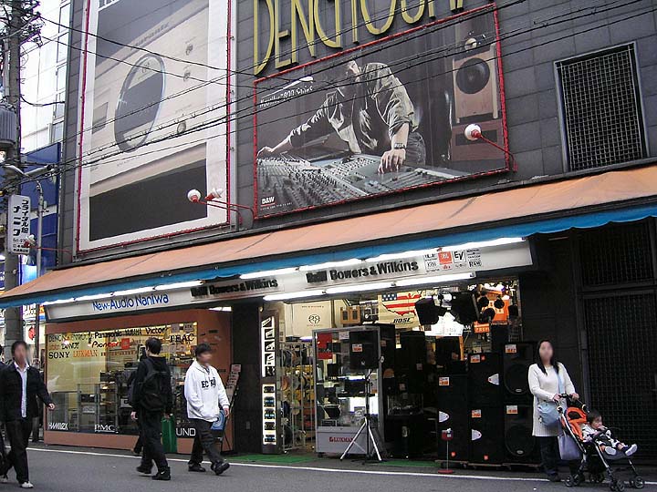 | オーディオナニワはこの裏通りに位置している。2階までが店舗。1階部分の右側半分は業務用スピーカーやDJ機器などが展示されており、左側は中古オーディオ機器と新品の初級中級オーディオ機器。オーディオアクセサリーやアナログアクセサリー類も1階に展示されているが、充実度はたいした事無い。2階は高級オーディオ機器の展示販売フロア。 | ||||||||||||||||||||||||||||||||||||||||||||||||||||||||||||||||