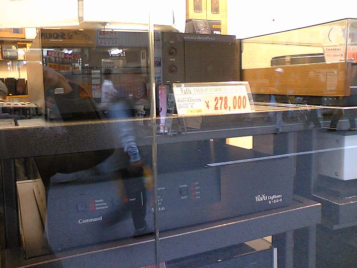 | ショーウインドウ越しにはなかなかの珍品、名機が展示されている。今回、目に留まったのはWadiaのトラポWT-2000SとDAコンバーターX-64.4セット。セットで278,000円はかなりお買い得。通常、WT-2000S(定価78万円)の中古相場は25万。DM-X64.4(定価135万円)の中古相場は20万円程度。15年ほど前の製品だが、ワディアはワディア。人気が高いのである。私自身、WT-2000Sの出物を探しているということもあり、買うべきか否か考え込んでしまった。状態は美品。WT-2000Sは古い機種だが、トラポなのでDACは関係ないし、メカはTEACのP2sと同等のVRDSメカを採用。筐体は頑丈そのもの。クロックを高精度なものに交換してやると、まだまだ第一線で活躍出来ると言う話もある。デザイン的にも好みであるし、私的にはかなり魅力的。