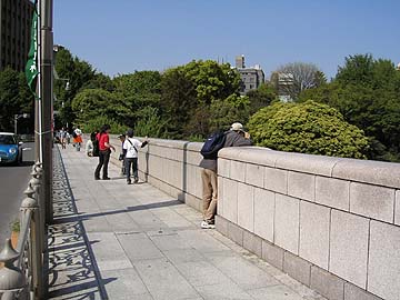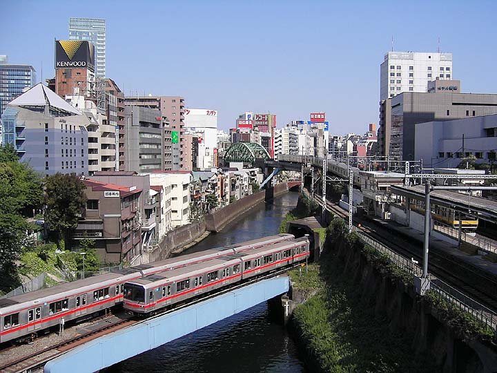 | 聖橋から東側(秋葉原方面)を望む。赤いラインの電車は東京メトロ丸ノ内線。丸ノ内線が地上に露出している数少ないスポットだ。手前右のJRお茶の水駅から中央奥に延びているのは総武線。その先に見えるビル群が秋葉原電気街。河と電車と緑とビル群が絶妙なコントラストをなしている。タイミングが良ければ、丸ノ内線/総武線/中央線が交差するところに出会えるかも。 | ||||||||||||||||||||||||||||||||||||||||||||||||||||||||||||||||