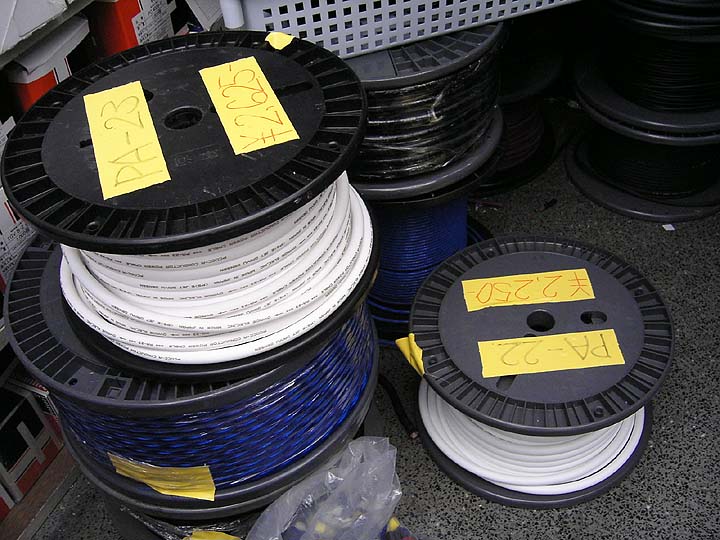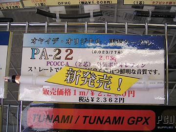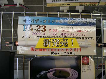 | こちらがオヤイデ電気店内に積まれているPA-22とPA-23。TUNAMIのジュニア版を開発中という話は以前、オヤイデ電気の村山社長から聞いたのだが、予告通りの製品に仕上がっている。私は早速、これらを2mづつ購入。近いうちに試してみたいと思っている。予想、TUNAMIのジュニア版であるからにして、これらはきっと素晴らしい音質に違いない。TUNAMI/TUNAMINIGOは切り売り最高峰に位置する電源ケーブルであると感じている。しかしながら、ケーブルが太くて硬めであるため、ケーブル取り回しの面ではやりづらい場合もあった。それを克服したのがPA-22とPA-23。仕様箇所や機器類に応じて、TUNAMI/TUNAMINIGOにするかPA-22/PA-23にするかを選ぶ事ができるようになったのだ。例えば、壁コンセントから電源タップ、パワーアンプなどの大電流機器にTUNAMI/TUNAMINIGO。そして、ソース機器やプリアンプなどの小電力機器にはPA-22とPA-23をあてがうと、とんでもない世界が開けそうだ。