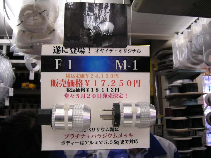 | 今回はもうひとつサプライズがある。それがこれ、新型電源プラグ/IECインレットコネクターF-1/M-1だ。18,112円/個とかなりの高額プラグ/コネクターだが、その価値はある。以前、F-1/M-1の試作品を聴く機会があった。このプラグコネクターに換えただけで音楽ががらりと様変わりしたのを実体験しているからだ。なお、発売は5/20である。現時点ではまだ発売されていない。