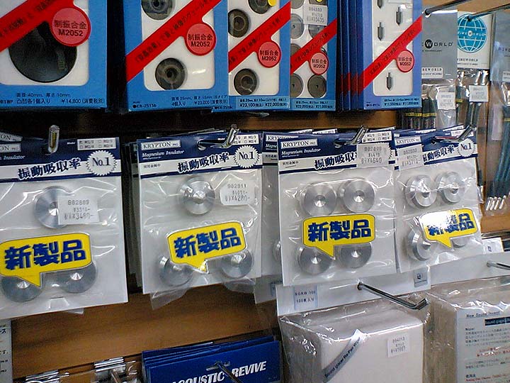 | ダイナミックオーディオ5555に入荷したKRYPTON Professional(クリプトンプロフェッショナル)の純マグネシウムインシュレーター。すでにオーディオ各誌で話題になっているので、ご存知の方も多いだろう。総発売元はサンシャイン。M1がスパイク受けで、4個セット実売4,640円。M2がスパイクで、4個セット実売5,710円。スパイクとスパイク受けをセット購入しても1万円ちょいで済む。同製品は同店以外にも、テレオン110、オーディオユニオンアクセサリー館などで扱い中。