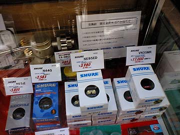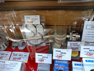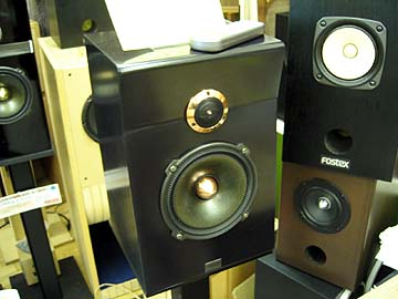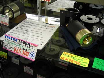 右はショーウインドウ内のスーパーツイーター。フォステクスの限定品T90A-EXが展示されている。300台の限定販売で、発売後すぐに完売。その後、若干数が追加流通した。コイズミ無線には5月初旬時点で数ペア在庫あり。マニアの注目がT500AMk2に向いてしまったため、追加流通のT90A-EXはあまり人気がないみたい。さて、T500AMk2の方だが、予約分にて初回入荷分は完売。現在、メーカーにて品切れ状態。 |
