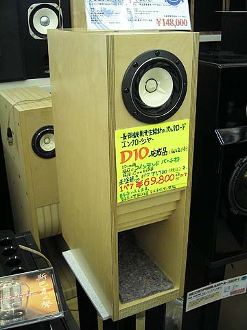D-10のペットネームは「バッキー」。長岡鉄男先生設計の中でも現実的な大きさのバックロードホーンスピーカーとして人気を博している。外形寸法はH580 W180 D370。この度、自作は出来ないが長岡バックロードを使ってみたい人のために、組み立て済みスピーカーボックスとして販売される事になったのだ。ペア69,800円は、材料費と工作の手間を考えると妥当な価格設定。表面は無塗装。ただ、展示品にはクリアーニス仕上げがされている。なお、価格はD-10スピーカーボックスのみ。購入者は別途、スピーカーユニット、内部配線、ターミナルを用意する必要が有る。フォステクスの10cm口径ユニットならどれでも適合すると思うが、事前にバッフル開口径を確認する事。お勧めは写真に搭載されているFE108EΣだろう。同店の店員さんも「これ小型スピーカーとは思えない鳴りっぷりで、かなりお勧めですよ」とのこと。箱、ユニット、その他パーツ類含めて10万以内で収まるはず。高さが低いため、スピーカースタンドをかませる必要がある。考慮すべき点は、奥に長大な設置面を有していること。 手っ取り早いのは、コンクリートブロックを使う事。2個積み上げて、その上にバッキーを載せれば、全高約80cmとなる。設置寸法的にちょうどよいし、なにしろ安上がりだ。 |