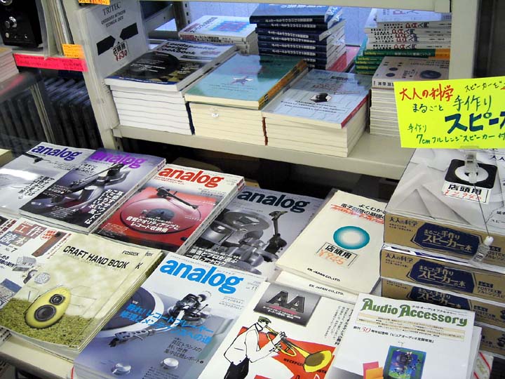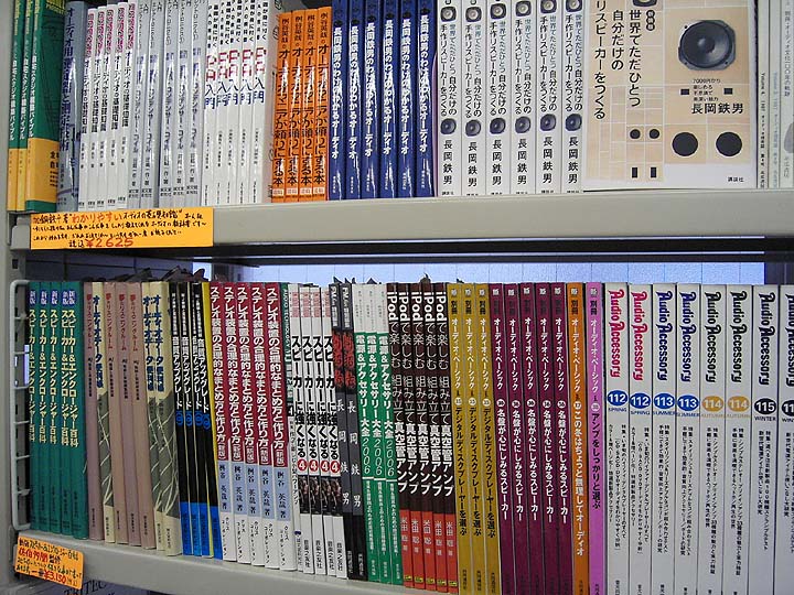 | こちらも書籍コーナー。音源出版刊行のanalogバックナンバーが平積みされている。同誌はアナログブーム再燃の牽引役。学研が発刊している大人の科学特別編集まるごと手作りスピーカーの本も並んでいる。 | ||||||||||||||||||||||||||||||||||||||||||||||||||||||||||||||||