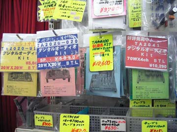 | 若松通商秋葉原駅前店。キムラ無線と同じ秋葉原ラジオ会館4階にある。カマデンのデジタルアンプキットが充実している。写真の真ん中、TAA4100キットが新登場。TRIPATH(トライパス)のデジタルアンプIC“TAA4100”を使用。BTL方式にて100W×2chを出力。基盤サイズは110mm×110mm。キット価格は12,600円。