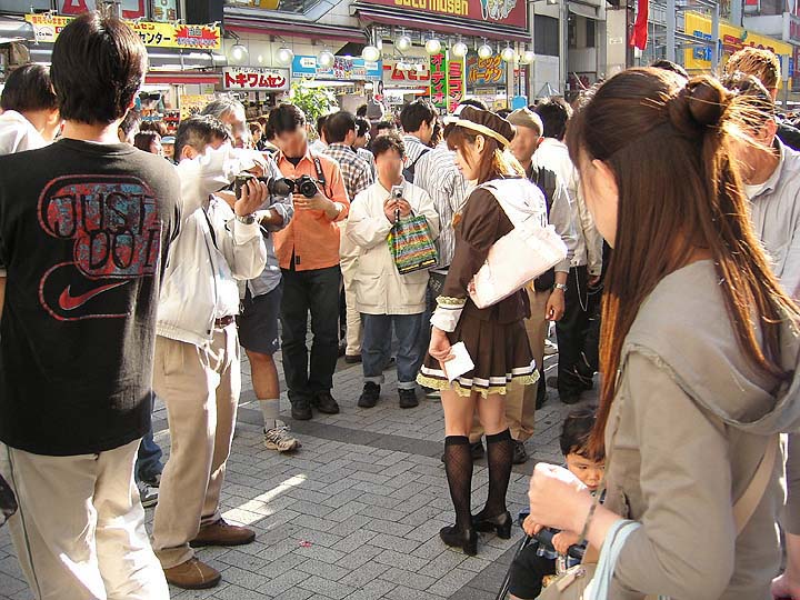 | 人混みの中心にはメイドさんが数名。駅前はコスプレ撮影会と化していた。だから混んでいたのか。 | ||||||||||||||||||||||||||||||||||||||||||||||||||||||||||||||||