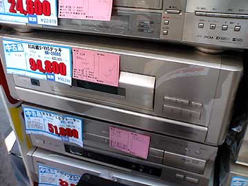 | セカンドハンズ。ビクターの最高峰VHSビデオデッキHR-20000。1992-1994年製造。定価42万円。中古948,000円。俗にいうバブルデッキのひとつ。バブルデッキには他に、三菱HV-V7000(1990年発売35万円)、パナソニックNV-V10000(1988年発売41万円)、ビクターHR-Z1(1991年発売30万円)が有名。1980年代後半〜1990年代前半にかけて、このような高級ビデオデッキがAVマニアの人気を博していたのだ。HR-20000はその中でも特に高い人気を誇っていた。とてもビデオデッキとは思えない重厚さ。現在でも人気が高い。ヤフオクでは8万円前後で取引されている。オープンボタンを押すと、フロントのカバーが電動で開き、ビデオテープ挿入口が表れる。