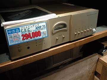| セカンドハンズの地下にあるオーディオユニオン新宿店。C.E.CのプリメインアンプAMP-71。2001年発売。現行製品。定価525,000円。中古294,000円。200W+200W/8Ω。カルロスカンダイアス氏によるA級LEFアンプだ。同店では年に数回、同機を見かける。オーディオライター村井裕也氏の愛機として記憶している人も多いんじゃないかな。
