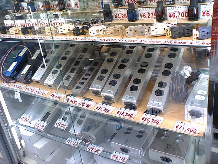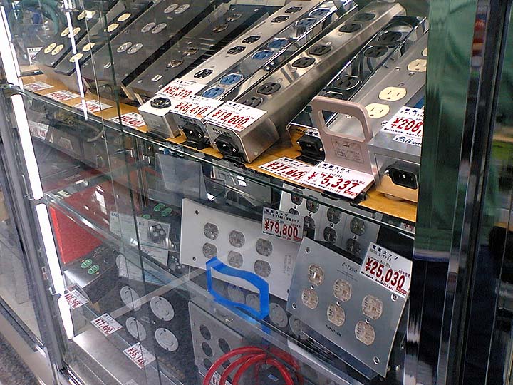 | ヨドバシカメラ新宿西口本店は国内有数のオーディオアクセサリー取扱い数を誇る。さすがは大規模小売店。販売価格はオーディオ専門店と同等か、やや高めの事が多い。ヨドバシ10%ポイントを鑑みると、けっこう安かったりする。上はコンセントと電源ボックスの陳列コーナー。メジャーなブランドの現行製品が軒並み陳列されている。オーディオテクニカ、ベルデン、チクマ、CSE、オーディオリプラスなどが確認できる。 | ||||||||||||||||||||||||||||||||||||||||||||||||||||||||||||||||