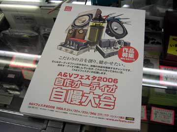 右は「自作オーディオ自慢大会」案内チラシ。今週開催予定のA&Vフェスタ2006での新企画イベントだ。A&Vフェスタ会場は恒例のパシフィコ横浜。会期は9月21〜24日の4日間開催される。 チラシの内容を一部抜粋・・・ 『手作りオーディオ機器の愛好家の皆様を対象にしたA&Vフェスタ2006「自作オーディオ自慢大会」を開催いたします。ひとつひとつの作品に注がれた制作者の想いを通して、オーディオの更なる魅力を伝えます。 ・・・こんな感じの内容だ。応募期間は2006年5月11日(木)〜2006年8月11日(金)。詳しくは応募規約をご覧あれ。A&Vフェスタらしい催し物だ。私も自作スピーカーが間に合えば、出してみようかなぁ。 |