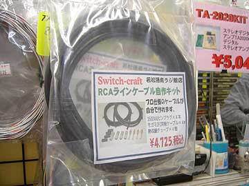 右は若松通商秋葉原駅前店(若松通商ラジ館店)。RCAラインケーブル自作キットが新登場。スイッチクラフトのRCAプラグ3502AAU×4個、モガミ製同軸ケーブル4m、熱収縮チューブがパッケージされている。4,725円。プラス側ハンダ付け必須。 |