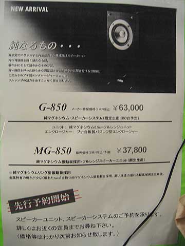 | コイズミ無線本店。ミツウロコビルの5階。雨天にも関わらず、来店者多し。ついに出ますよ純マグネシウム!FOSTEXの新製品が予約受付中だ。オーディオ雑誌にも掲載されているので、目敏いマニアはすでにご存知の事と思う。そう、それは純マグネシウム振動板フルレンジユニットMG-850。ペア37,800円。MG-850を専用スピーカーボックスに納めた完成品スピーカーも登場。G-850という品名で、ペア63,000円。エンクロージュアはバーチ合板で出来ているようだ。ユニット、完成品ともに300台の限定販売。6月初旬に入荷予定。MG-850のコイズミ無線割り振り台数は100台。すでに予約が続々入っていた。欲しい方は取り急ぎ電話で残数を確認すべし。8.5cmユニットだが、フレームはFE88ES-Rと同じ。専用のアダプターリングを使えば、10cmユニットとして扱えるはず。勝手な推測だが、スワン派にはうってつけのユニットなんじゃないかな。長岡先生がご存命ならば、純マグネシウムユニットの到来をどう評されたか・・・。