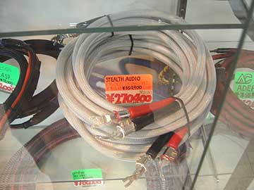 | テレオンサウンド110(テレオン第二店)の3階アクセサリーフロア。左はSTEALTH AUDIOの新製品。スピーカーケーブルNEWGENERATION HYBRID MLT。2.5mペアで定価354,900円の実売270,400円。プラスとマイナスが独立しているのが特徴。端末はWBT。ステルスのケーブルはどれも皆、仕上げが美しい。編みチューブを多重被服し、独特の質感を導きだしているのだ。音質傾向は知らん。