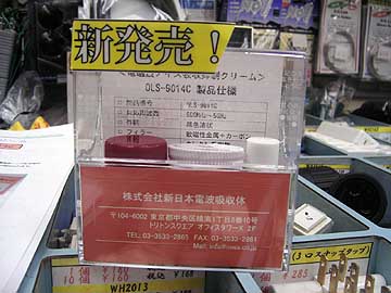 | こちらは電磁波吸収クリームOLS-9014C。8,400円。これは株式会社新日本電波吸収体というメーカーの製品。基盤上の電子部品に塗布する事で、それらから発せられる電磁波を吸収してしまおうというアイテム。電磁波吸収クリームと専用稀釈剤 と絶縁コート剤MS-X18、その他計量スプーンなどがセットになっている。説明が面倒なので、オヤイデ電気のサイトから説明文を抜粋する。