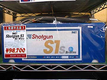 MITのスピーカーケーブルShotgunS1s。258,300円が中古98,700円。Bi-Wireタイプなので、ターミネーターからスピーカー側に向けて4本のケーブルが引き出されている。かなり欲しかったりするのだが、自粛自粛。MITの特徴についてはナイコムのサイトWhat'sMIT?をご覧あれ。 |