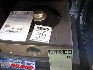 | マランツの CDプレーヤーCD23。定価20万円。撮影時では値札が無かったが、数日後99,800円の値付けがなされていた。トップローディング方式。鍋の蓋を開けるようにしてCDをセットする。このコジャレた外見がウケるようで、現在でもそれなりの人気がある。音は特に突飛でもなく、ごく普通だとのうわさが。メカはフィリップスのスイングアームメカCDM9を使用している。細かいバージョンやら限定モデルなどが存在する。これは2世代目のCD-23Dだったかな。アナログRCA1組とデジタルRCA1個というシンプルな出力。なお、今月上旬、オーディオユニオン新宿店にCD-23LTDが実売99,800円で入荷している。こちらは出力端子がやや多めについていたと思うが、なにがどうだったか忘れてしまった。