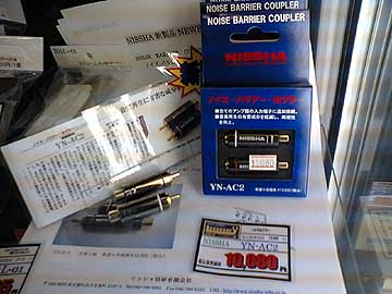 右はニッシャ久々の新製品。ノイズバリアカプラーYN-AC2というアクセサリー。価格は2個で10,080円。ニッシャらしいオーソドックスな外見。アンプ側のRCA入力端子にこれを仲介させて用いる。プラグ内部に特殊回路が内蔵されており、高周波ノイズを除去する効果があるという。RCAプラグタイプの音質向上アクセサリーはいままでも幾つか存在していたが、かなりマイナーな扱いがなされていた。さて、YN-AC2はどこまでがんばれるかな。 |