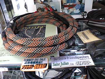 右はZuCableのスピーカーケーブル新製品Saint JULIAN (セイントジュリアン)。なんとも個性的なジャケット配色だ。サンゴヘビみたい。 |