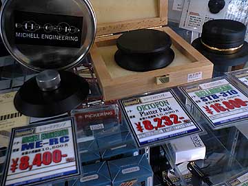 | こちらはレコードスタビライザー。このカテゴリーも最近、新製品が相次いでいる。真ん中はオルトフォンのPlatter Pack。いままで見た事無いものなので、たぶん新製品だろう。定価10,290円、実売8,232円とお手頃価格。左はMICHELL ENGINEERINGのレコードスタビライザーME-RC。8,400円。正確にはレコードクランプである。