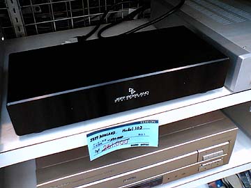 テレオン第2店(テレオンサウンド110)。1階のコンシューマー/ミドルクラスフロアにジェフローランドのパワーアンプが入荷。Model102というステレオパワーアンプである。同社の小型モノラルパワーアンプModel501をステレオ一体化し、さらにコンパクト化したような製品だ。定価29万円で、実売261,000円以下になっている。黒仕上げがかっこいい。横幅350mmで、奥行きはかなり小さい。ジェフローランドがこのようなお手頃価格のアンプを出してくるとはびっくりだ。同社の新機軸アイスパワーと呼ばれるデジタルアンプ技術によって、このような極小筐体が可能となった。出力は100W×2ある。筐体はアルミの削り出し。ジェフ独特のへアライン仕上げも施されている。同店には在庫があり、お持ち帰り可能との事。たしかにこの大きさなら持って帰れるな。なお、近月中に同機とペアになるプリアンプも発売予定。 |