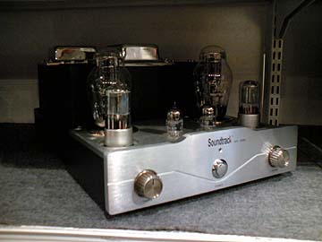 右は300B使用の管球プリメインアンプ。SoundtrackというメーカーのHIFI-300B3というアンプ。300B×2 12AT7×2 6N8P×2の構成。販売価格は138,000円。電源ケーブルは脱着式。Soundtrackは中国のメーカーらしいが、それ以上の詳しい事は不明。 |