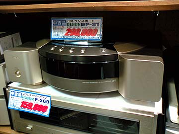 右はDENONのデンオン時代の名機、最高級CDトランスポートDP-S1。1993年発売。定価88万円、中古実売298,000円。重量16.7kg。久々に見かけたなぁ。DP-S1は長岡鉄男先生の長きにわたる愛機だった。探している人いるんじゃないかな。DCD-S1(定価50万円)は中古市場にも頻繁に登場するが、DP-S1が中古に出てくる事は稀。7月8日時点ではまだあったので、探している方は同店に電話で売約するのが良いだろう。デンオンというかデノンは、DP-S1以降ここまで凝ったソース機器を出していない。後にも先にも同社最高級の光ディスクプレーヤーと言えるだろう。ちなみに、DP-S1と対をなすDAコンバーターとしてDA-S1(定価78万)が存在した。 |