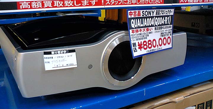 | こちらは中野のフジヤエービック。6月末に訪問。PSEショックから2ヶ月、中古在庫量は回復しつつあるが、やはり後遺症は残っている様に感じた。海外製の高級コンポが、以前より少ないのだ。ま、それは仕方の無い事として、ソニーのQUALIA004(Q004-R1)が中古入荷!定価2,520,000円が中古880,000円。3管方式の時代に比べると、価格的にもサイズ的にもずいぶんと手頃になったプロジェクター。ただ、このQ004-R1は価格的にもサイズ的にも3管プロジェクターを彷彿とさせるものがあるなぁ。ま、我が家にはこんなもの設置のしようがないので、ただただ凄いなぁと眺めるだけだが、ハイエンド液晶プロジェクターを探している人にとっては、なかなか魅力的な出物かもしれんなぁ。 | ||||||||||||||||||||||||||||||||||||||||||||||||||||||||||||||||