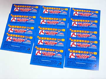 | 秋葉原では現在、秋葉原電気まつりが開催中。期間は6月17日から7月30日まで。半年に一度のイベントだ。主催は秋葉原電気振興会。今回は加盟店でのお買い物5,000円毎に、抽選券1枚がもらえる。1等は10万円のお買い物券。前回はスクラッチだったが、今回はめくり上げるようになっている。ちなみに、昔は宝くじ同様、抽選券毎に番号が振られており、当選番号を後日公開していた。ちなみに私は今回も全て外れた!秋葉原に相当お金を捧げているのに、いままで一度も当たった事が無いぞ!