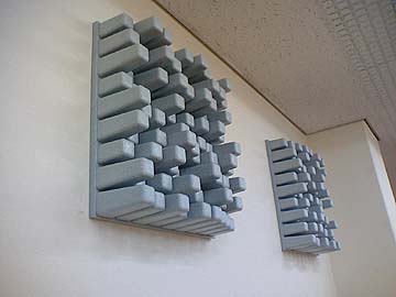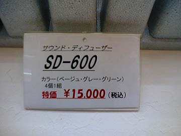 | 河口無線2階。壁に貼られていたのはQRDのスカイラインに似た拡散パネル。スチロール製。これ、昨年のハイエンドショウで見かけた事があるのだが、製品名はわからなかった。それが今回ようやく判明。どこのメーカーのものかは不明だが、値札にはサウンドディフューザーSD-600と書かれている。値段は15,000円/枚。写真はグレータイプ。 | ||||||||||||||||||||||||||||||||||||||||||||||||||||||||||||||||