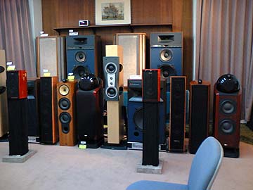 | 河口無線2階のスピーカー展示コーナー。ご覧の通り、各ブランドの有名スピーカーが整然と陳列されている。