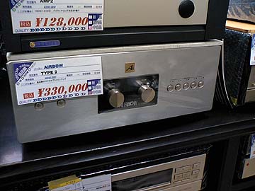 | さて、こちらは逸品館2号館の中古状況。目を惹いたものを幾つか。まずはAIRBOWのプリメインアンプTYPE2。定価85万円が中古33万円。同機はNEC往年の名機A-10Xの流れを汲むアンプ。AIRBOWのアンプ開発には、NECから分離独立したAUTHENTIC(オーセンティック)が技術提供している。だからA-10Xと似ているのも道理が行く。