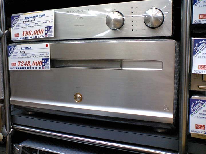 | こちらは逸品館1号館。LUXMAN(ラックスマン)のパワーアンプM-08。でかいなぁ。定価58万円が中古売価248,000円。M-08は1994年に発売された同社最上級パワーアンプ。プリアンプC-08や、プリメインアンプL-580も同じ時期に発売されている。この当時のラックスらしいデザインだ。重量は41.9kg。往年のラックスらしく、ボンネットは木製。出力200W×2。電源ケーブルは直出し式。年式を考えるとやむを得ない。長岡鉄男先生のM-08批評記事によると「音は豪快で切れが良く、伸びがあり、聴感上のfレンジ、Dレンジが広い。SN比が良く透明感も高い。06αを女性的とすると08は男性的、ウーファーのコーンをしっかり捕まえて正確にドライブしている感じがある」と述べられている。 | ||||||||||||||||||||||||||||||||||||||||||||||||||||||||||||||||