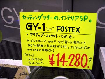 | コイズミ無線本店入り口ではフォステクス「GY-1エア」が展示されていた。デモ機の色はウォームシルバー。GY-1はアクティブコンタクトスピーカーと題した新方式スピーカー。設置した場所に振動を与え、その面を振動板として利用、設置面から音波を発生させるというもの。卓上などにポンと置いて、気軽に音楽を楽しめる。ただし、モノラル再生である。同社研究者の方から以前聞いた事があるのだが、会議用などのビジネス用途にも好適らしい。持ってみれば分るが、ずっしりと重い。設置面に正確な振動を伝えるには、ある程度の重量が必要らしい。 | ||||||||||||||||||||||||||||||||||||||||||||||||||||||||||||||||