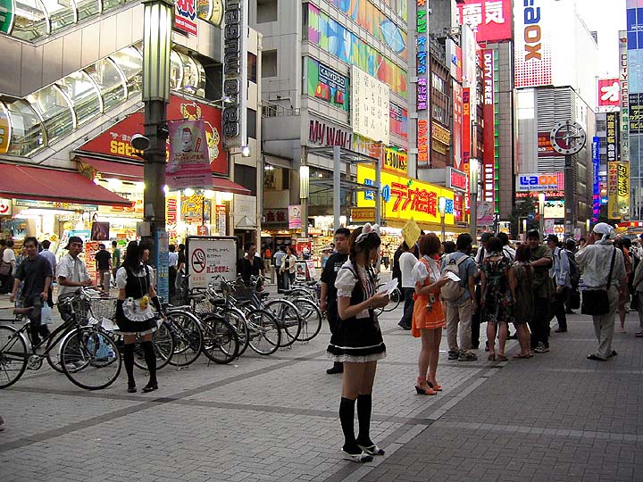 | これが最近の駅前の実態。ご承知、メイド喫茶のチラシ配りだ。日曜日ともなると、駅前周辺だけで、二桁台のメイドさんがメイド喫茶の案内チラシを配っている。面白いのは、秋葉原観光客がメイドさんと記念撮影していたりすること。メイド服姿は、もはや秋葉原の名物となっている。アニヲタ、オーヲタ、オーバークロッカーに、家族連れ、カップル、観光客に外国人・・・。まぁ兎にも角にも玉石混淆のアキバである。 | ||||||||||||||||||||||||||||||||||||||||||||||||||||||||||||||||
