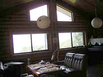 | 山小屋の内部。窓からは山々の緑が眺められ、地平線上には琵琶湖が広がる。近くを流れる小川のせせらぎと小鳥のさえずりがBGM。癒しの空間だ。小規模ながらオーディオシステムも置いてある。 | ||||||||||||||||||||||||||||||||||||||||||||||||||||||||||||||||