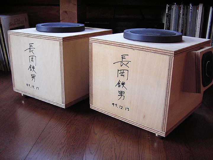 アンプとCDPは、私が高校の時に使用していたもの。スピーカーは故長岡鉄男先生設計製作による「F-52かるわざ」。品川のラックス本社で開催された「長岡鉄男オリジナルスピーカー大集合〜現作品チャリティーオークション〜」にて、私がじゃんけんで競り落としたもの。オーディオアクセサリー誌87号(1997年)に掲載されていた作例そのものである。ローボーイフロアタイプスピーカーという位置づけ。床に直置きして、床に座る、あるいは低いソファに腰掛けてのリスニングを前提としたスピーカーだ。大きさはブックシェルフだが、フロア直置きなのでFの頭文字が与えられている。ユニットはフォステクスFW168+FT27Dの組み合わせ。FW168はネットワーク無しで、信号の劣化を回避。天井面に取り付ける事により、不要な高域信号は上方に拡散。リスニング側には低域信号のみが来るように設計されている。長岡先生らしい、シンプルネットワークな設計だ。似たような設計手法には、BS-96がある。 |