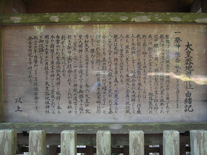 | 神社に掲げられている札。神社の名称は大皇器地祖神社。日本の椀器製作発祥の地とのこと。神社の廻りには小さな集落がある。携帯電話の電波も通じない秘境だ。 | ||||||||||||||||||||||||||||||||||||||||||||||||||||||||||||||||