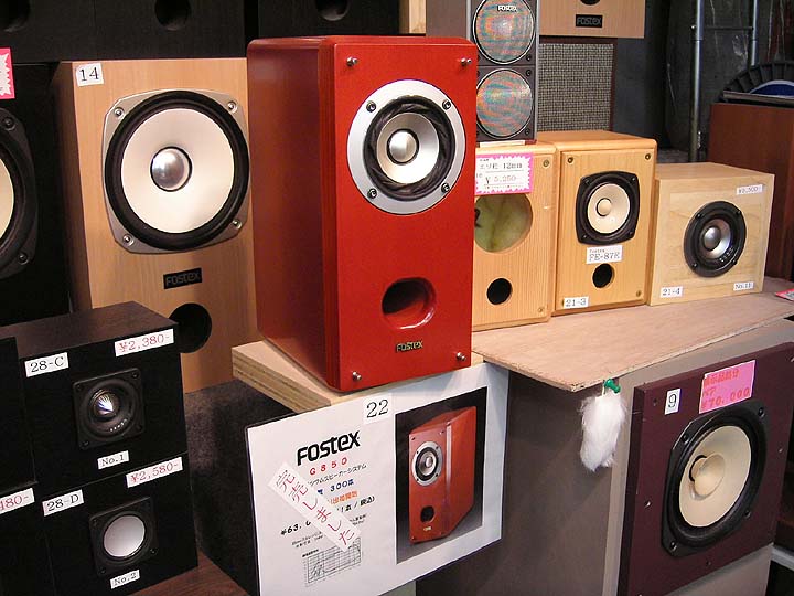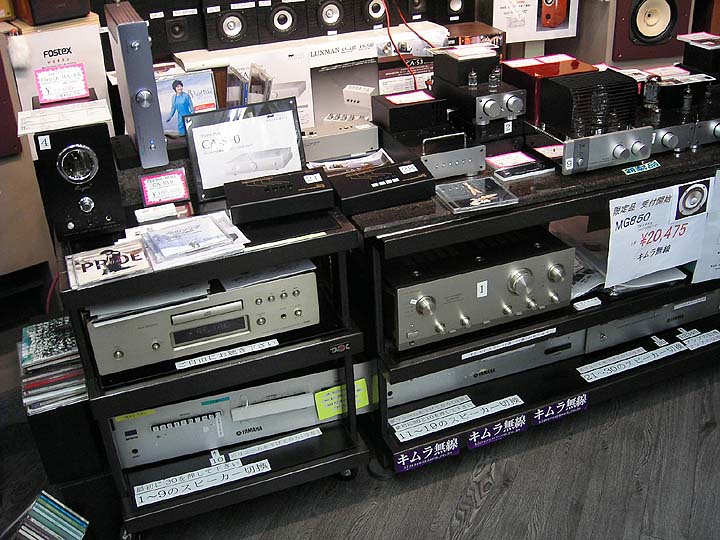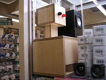 | キムラ無線。スピーカークラフト店として、またオーディオアクセサリー店として、オーディオ業界の老舗店たる地位を得ている。上の写真はキムラ無線のスピーカーユニット試聴コーナー。スピーカーの上にさらにスピーカーが積まれているため、必ずしもベストなセッティングとは言えないが、ユニット毎の音質傾向の違いを確かめることはできる。スピーカーのセレクトは手前のオーディオラックの下段にあるセレクタースイッチでおこなう。 | ||||||||||||||||||||||||||||||||||||||||||||||||||||||||||||||||