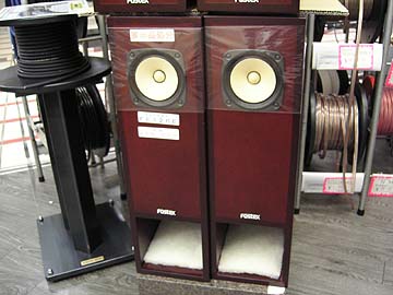 | こちらはフォステクスのスピーカーボックスにフルレンジユニットFE126Eを取り付けたもの。現品処分品。右はバスレフ型で39,000円/ペア。高いのか安いのか微妙だ。このスピーカーボックス、実はフォステクスが販売を予定して製作したものの、何らかの理由で販売まで至らなかった品らしい。ワインレッドの外装が渋い。秘技のスピーカーはバックロード型だ。59,000円ペア。 | ||||||||||||||||||||||||||||||||||||||||||||||||||||||||||||||||