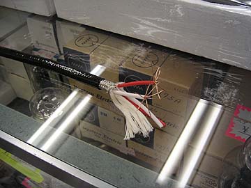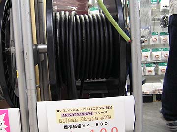 | こちらは新入荷のスピーカーケーブル。ナノテックシステムズ初のSPケーブルGolden Strada♯79だ。すでに雑誌で取り上げられたりしているのでご存知の方も多いだろう。今年2月の発売になっているが、店頭に現れたのはもっと後だったように思う。ナノテックお得意の金コロイド溶液でOFC導体を覆っているのが特徴。これにより電気が流れ易くなり、クリアなサウンドが得られるんだとか。見た目はフツーのケーブルだ。導体にナノ粒子を染み込ませるアイデアは以前、季刊A&Vビレッジ誌上にて誰かが実験していたように記憶している。
