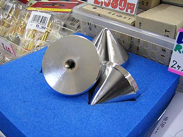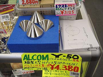 | コイズミ無線本店。8月26日(土)訪問。情報が最新でなくてすいません。 それはさておき、このスパイク型インシュレーターは、同店オリジナルブランド「ALCOM」のY-50。2個で4,380円。真鍮にメッキ掛け。スパイクインシュレーターとしては、中くらいか、やや大きめ。最大外形はφ50ほどだったように思う。けっこうでかくて重量感あり。M8のネジが掘ってあるので、オーディオ機器類にセットしやすい。記憶が定かではないが、VRDS-25xsにはアダプター無しで直接取り付けられるんじゃないかな。 |