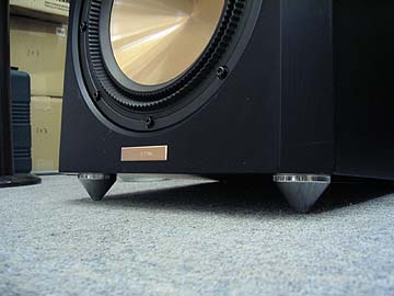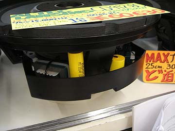 | さて、このインシュレーターY-50は、上の新型サブウーハー用に設計製作されたものらしい。写真のように前面2カ所にY-50を取り付け、角度を持たせたセッティングをおこなっている。このサブウーハーもコイズミ無線オリジナル。アルパインのカーオーディオ用新型ウーハーを搭載したサブウーハーだ。私が訪れた8月末時点では発売予定の価格未定だったが、そろそろ型番や値段も決まっているのではないかと思う。なかなかシンプルで好ましいデザイン。音も本格的。メインスピーカーを邪魔しない程度に、適度に重低音を付加してくれる。 | ||||||||||||||||||||||||||||||||||||||||||||||||||||||||||||||||