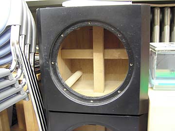| こちらは上述のサブウーハーのエンクロージュア。内部は十字に補強梁が張られている。フロント板厚は12mm+18mmの計30mmだったと思う。合板の種類まで聞き忘れたが、たぶんシナ合板だと思う。