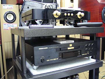 右はコイズミ無線の試聴システム機器。Y-50インシュレーターがBOWのプリメインアンプZZ-ONEと、マランツのSACD/DVDプレーヤーDV9600にセットされている。 |