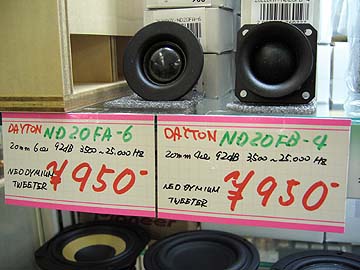 右はDAYTONAUDIOというブランドのトゥイーターND20FA-6とND20FB-4。安い!DAYTONはアメリカのオーディオメーカーらしい。92dBなのでまぁまぁ使い易い。スペック上、上は25,000Hzまで延びている。 |