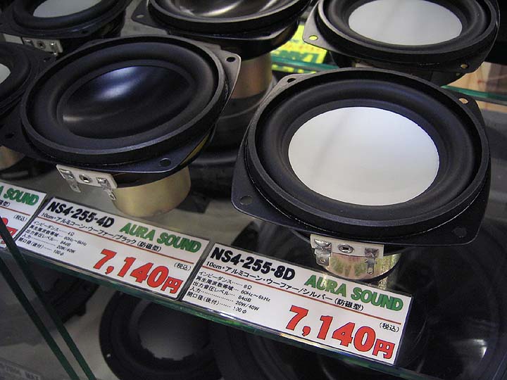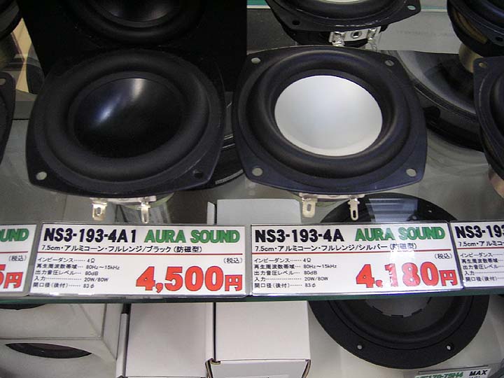 | アメリカのAURA SOUNDというユニットも多数入荷。台湾のTBが一段落したら、今度はアメリカ勢の威勢が良いようですな。写真の2本のユニットはコーンの色違いだけで、寸法、スペックは同じ。銀色のがNS4-255-8D。黒いのがNS4-255-4D。10cmアルミコーンウーハーだ。防磁型。 | ||||||||||||||||||||||||||||||||||||||||||||||||||||||||||||||||