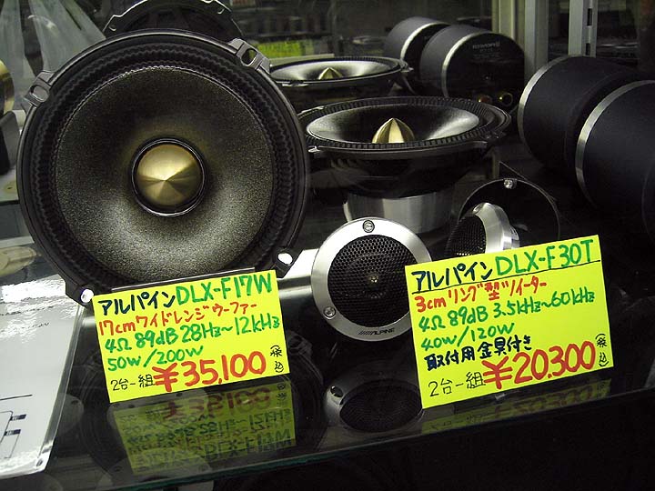 | こちらはアルパインのカーオーディオ用ユニット。ウーハーはDLX-F17W、ツイーターがDLX-F30Tという。1年ほど前に発売されたユニットなので目新しいものではないが、今回ショーウインドウでの陳列を始めたのでご紹介。なぜにコイズミ無線で扱っているかと言うと、このユニットがホームオーディオ用としても十分な素性を有しているからだ。このユニットを使用したコイズミ無線オリジナルスピーカー(完成品)ALCOM-X55も存在する。このスピーカーに関しては、巡礼記2005.12.28「2005年師走の秋葉原界隈」に掲載しているので、参考にして欲しい。 | ||||||||||||||||||||||||||||||||||||||||||||||||||||||||||||||||